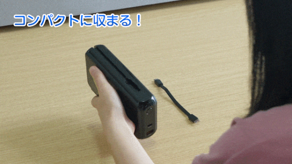 Macbook ProなどApple製品の充電に使用するType-C着脱式ケーブルが1本内蔵されており、充電しないときはケーブルを本体に収納できるので、バッグの中でさまざまなケーブルが絡まることがありません。
