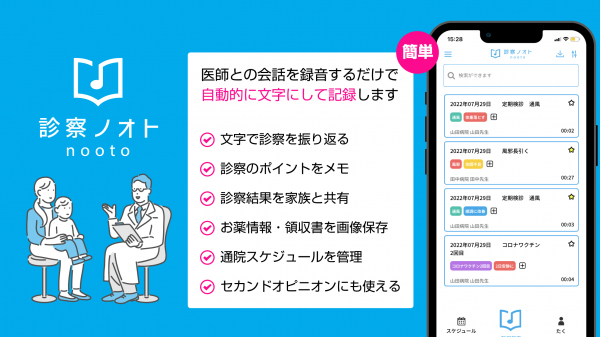 病院・クリニックの診察時に医師との会話を録音し、診察データを文字情報で記録できるアプリ「診察ノオト」をiOS、Androidでリリース