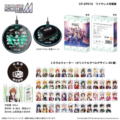 尚、『THE IDOLM@STER SideM』のその他のグッズとして「ワイヤレス充電器(1種類)」「ミネラルウォーター(49種類)」を販売致します。「ワイヤレス充電器」は、通販サイト「ONKYO DIRECT」、秋葉原店舗「音アニ」ともに、9月30日(金)15:00〜販売開始、「ミネラルウォーター」は、10月中旬の販売を予定しています。販売時期が決まり次第、下記SNSにてご案内致します。