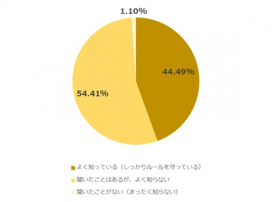 Q.音楽著作権について知っていますか?の質問に対して、「よく知っている(しっかりルールを守っている)」と回答したヨガインストラクターは44.49%にとどまり、「聞いたことはあるが、よく知らない」「まったく知らない」と回答した人は55.51%という結果になりました。
