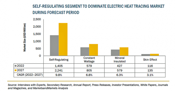 電気ヒートトレースの市場規模は、2022年の25億米ドルからCAGR8.3%で成長し、2027年には38億米ドルに達すると予測されています。同市場の成長は、従来の蒸気トレースシステムよりも電気ヒートトレースシステムの採用が進んでいること、エネルギー効率の高い電気ヒートトレースシステムの需要が高まっていること、そのメンテナンスコストが低いことに起因しています。