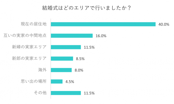 「現在の居住地」が40%、「互いの実家の中間地点」が16%、「新婦の実家エリア」が11.5%、「新郎の実家エリア」が8.5%、「海外」が8%、「思い出の場所」が4.5%、「その他」が11.5%でした。