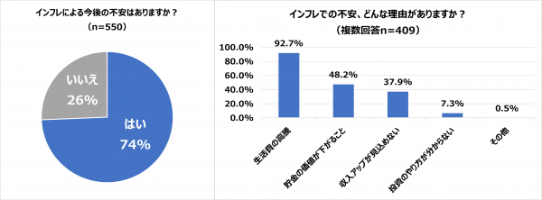 ・インフレによる不安を感じる人は74%、その内、「生活費の高騰」を理由にあげる人は92.7%に
