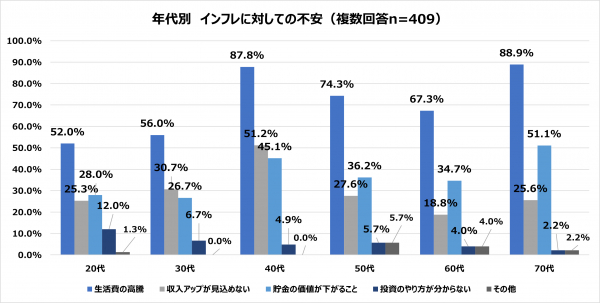 インフレによる今後の不安があると答えた人を年代別に見ると、40代は半数以上が「収入アップが見込めない」と回答し、他の世代を大きく上回ります。また、「貯金の価値が下がること」と答えた人も45.1%と、70代に次いで高くなりました。