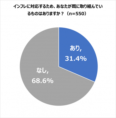 インフレに対しての不安を感じている人が74%に対して、現在既に何かに取り組んでいる人は31.4%という結果になりました。