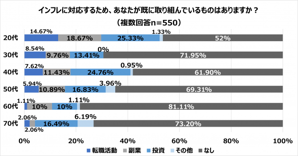 年代別の割合で見ると、「取り組んでいるものがない」と答えた人の割合が高いのは、60代、70代に次いで30代でした。それに対して、20代は48%がインフレに対応するための取り組みを行っており、転職活動、副業を抑えて「投資」を行っている人が25.33%となりました。