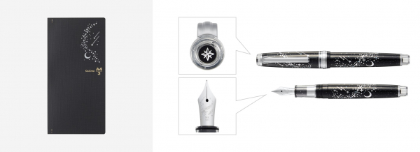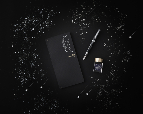 コラボレーション企画第6弾のテーマは“星空”。ノートには、流星群の美しい星空をシルバーの箔押しで表現。万年筆は、空気が澄んだ空を連想させる透明のブラックのボディ全体に、星をイメージした細かいシルバーラメと明るい恒星や月をデザインしています。14金のペン先・蓋栓にもワンポイントの1等星柄を施しました。また、インクカラーは星空をイメージしたダークパープルを新たに調色。ギフトボックスも星空を連想するカラーを採用しました。満点の星空に思いを馳せて、一日の終わりにノートや日記をつけたくなるキラリと輝くステーショナリーセットです。