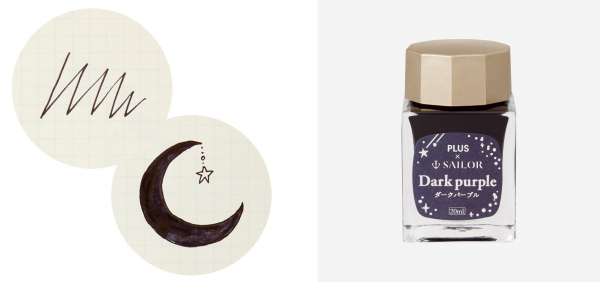星をイメージし、新たに調色した限定ダークパープルです。ほんの少しパープルを感じるブラックで、ノートのクリーム色の中紙にもきれいに発色、色の濃淡が楽しめます。また、ラベルは星空をイメージしたデザインにシルバーの箔押しがあしらわれています。使い切りやすく、かわいらしい20mlのミニボトル入りです。