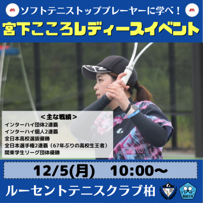 株式会社ルーセント(本社:千葉県柏市、代表取締役社長:中野吉広)が運営する「ルーセントテニスクラブ柏」は12月5日(月)に、皇后杯2連覇を果たした宮下こころ選手によるソフトテニスイベントを開催します。対象は大人女性プレーヤーで、宮下選手による講習会を実施。また、宮下選手と実業団チームによる女子ダブルスエキシビジョンマッチも行います。