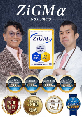 ZiGMαは、いつまでも現役でいるために必要な成分をたっぷりと配合した精力・活力アップサプリメント。特許素材の牡蠣エキスや業界最大量の亜鉛をはじめ圧倒的な成分配合で漢としての自信を強力サポートします。