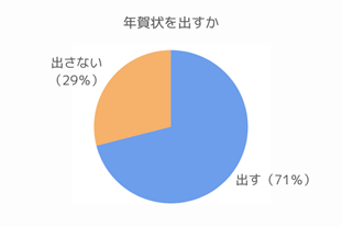 71%が「出す」と回答した。SNSの発達で年賀状の配達枚数は減少傾向にあると言われているが、SNSも含めれば年賀状を出すという人が大半を占めているということが分かった。