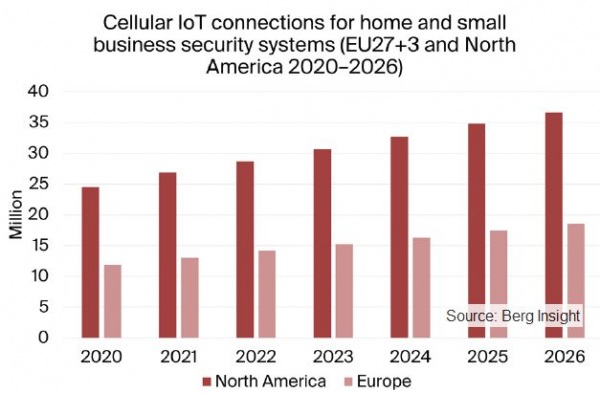 Berg Insightでは欧州と北米における家庭向けおよび小規模企業向けセキュリティシステムのセルラーIoT接続数が2021年の3,990万から2026年には5,520万となり、年平均成長率6.7%で増加すると予測しています。