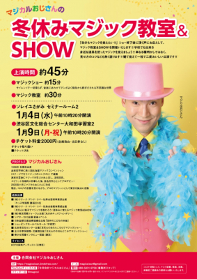 合同会社マジカルおじさんは、「観る・覚える・発表する」三拍子揃ったマジカルおじさんの冬休みマジック教室&SHOWを開催いたします。ぜひ冬休みにマジックを覚えて友達を楽しませましょう。お越しをお待ちしております。