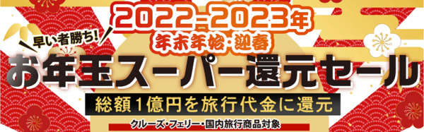 この「お年玉スーパー還元セール」は、先着3,000名のお客様へ総額1億円分の旅行代金を還元するキャンペーンとなっております。対象商品は、国内・海外クルーズ、国内フェリー、国内旅行商品になります。キャンペーン期間は、2023年1月15日12:00までとなります。