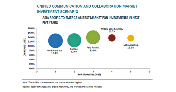 UCC(ユニファイドコミュニケーション&コラボレーション)の市場規模は、2022年の767億米ドルからCAGR13.0%で成長し、2027年には1416億米ドルに達すると予想されています。企業がデジタルシフトを受け入れるようになり、UCCは急速に進化しています。さまざまなビジネスプロセスやアプリケーションに接続することで、UCCソリューションは企業全体のワークフローを変革すると期待されています。チャットセッションや通話を開始するためにユーザーがアプリケーションを終了する必要がないように、ユニファイドコミュニケーション(UCC)企業は、クライアントが既存のアプリケーションに簡単なコラボレーション機能を組み込むことができるAPIを提供するようになっています。ユニファイドコラボレーションツールや機能は、以前はプラットフォームの「追加」機能として考えられていましたが、経験豊富なクライアントがこれらの機能を高く評価するようになっています。チームコラボレーション機能は、ユーザーエクスペリエンスの中心的役割を果たすべく進化しています。
