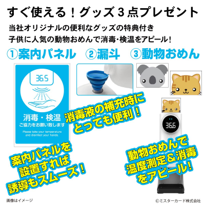 案内パネル、漏斗、動物おめんの3点プレゼント