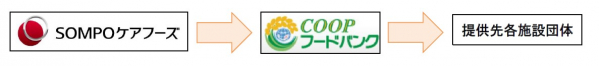 SOMPOケアフーズが食品・食材をコープフードバンクへ送付し、それらをコープフードバンクのスタッフが中心になり、仕分けを実施します。仕分けられた食品・食材は、提供先各施設団体へ寄贈されます。