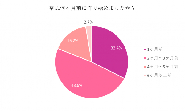 「1ヶ月前」32.4%、「2ヶ月〜3ヶ月前」48.6%、「4ヶ月〜5ヶ月前」16.2%、「6ヶ月以上」2.7%でした。