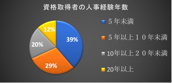 資格取得者の人事経験年数を見てみますと、人事経験5年未満が全体の39%と最も多く、次いで5年以上10年未満(29%)、10年以上20年未満(20%)、20年以上(12%)となっており、人事経験年数が短い方がより多く人事資格を取得しています。