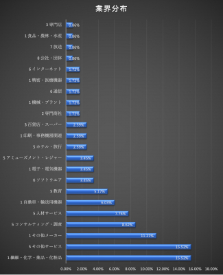 業界を見てみますと最も多い分類が、繊維・化学・薬品・化粧品の業界(実際には製薬)とサービス業となっています。双方とも全体の15.52%で、合わせると全体の3割を超えます。しかしながら、業界は多岐にわたっています。