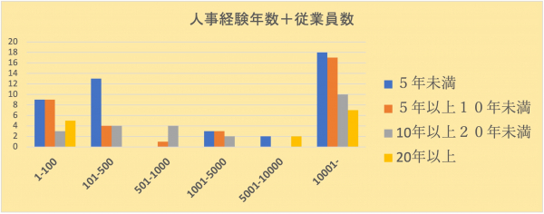 これは、人事の基礎を学ぶ講座であるという特性もありますが、資格取得者の所属する組織の規模を見ると1万人以上の大規模組織が最も多い(全体の約半数である44.83%)ことあることがより影響していると考えられます。特に日本の大規模組織に属している場合、定期的な人事異動により人事業務に就いている資格取得者が多いためです。「人事経験年数+従業員数」のグラフにおいても、人事経験年数の短い受講者の数が最も多いのが従業員数1万人を超える組織に属している事で示されています。