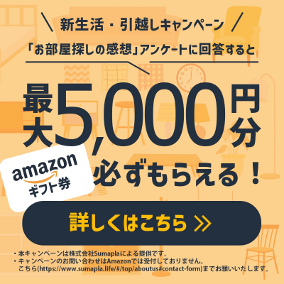お部屋探しのアンケートに回答すると、もれなくAmazonギフト券(最大5,000円)”がもらえる。新居での必需品購入に利用してもらう想定である。