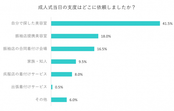 「自分で探した美容室」41.5%、「振袖店提携美容室」18%、「振袖店の合同着付け会場」16.5%、「家族・知人」9.5%、「呉服店の着付けサービス」8%、「出張着付けサービス」0.5%、「その他」6%でした。