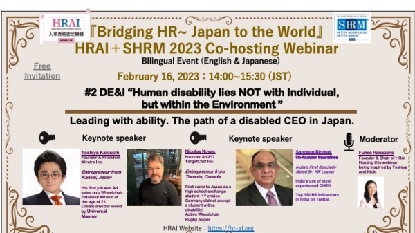 HRAI+SHRM共催ウェビナーの第2回目は車いすに乗った起業家として活躍し、素晴らしいCEOである垣内俊哉さん(株式会社ミライロ代表取締役社長)とニコラス・コバックさん(株式会社ターゲットキャスト)に登壇いただき、「経営理念」と「これからの人事に求めること」についてお話を伺います。SHRMからはインドの障がい者支援の第一人者で、ツイッターに おけるインド人事インフルエンサートップ100にも選任された、サンディープ・ビンダニさん(サーラター共同創立者)が登壇し、 垣内さん、ニコラスさんとのパネル対談にも参加いただきます。