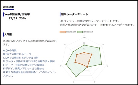 「Yesの回答数/回答率」と、大項目ごとの得点がレーダーチャートで表示されます。
