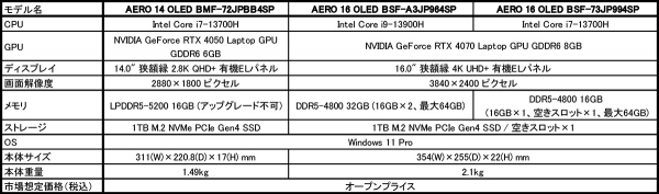 今回発売するのは、ディスプレイに14.0型有機ELパネルを搭載した「AERO 14 OLED BMF-72JPBB4SP」と、16.0型有機ELパネルを搭載した「AERO 16 OLED BSF-A3JP964SP」および「AERO 16 OLED BSF-73JP994SP」の計3モデル。