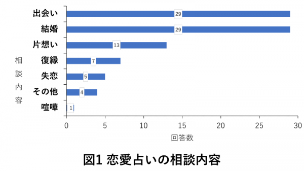 恋愛占いの相談内容について最も回答数の多かった内容は「出会い」と「結婚」。