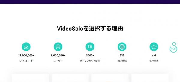 次に、ダウンロト数、ユーザー数などの具体的なデータを見せるようにして、VideoSoloは世界中でたくさんの利用者の信頼を受けていることをより直感的に示します。
