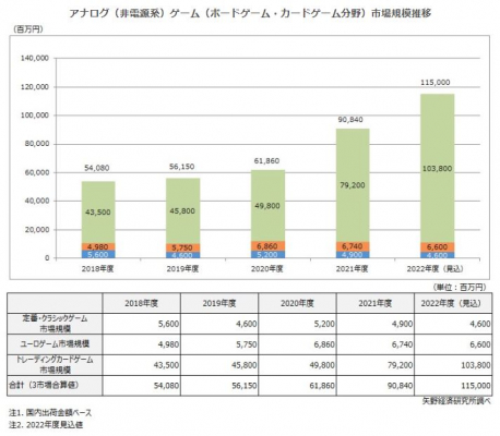2022年度のアナログ(非電源系)ゲーム(定番・クラシックゲーム、ユーロゲーム、トレーディングカードゲームの3市場合算値)市場規模は国内出荷金額ベースで、前年度比26.6%増の1,150億円を見込む。