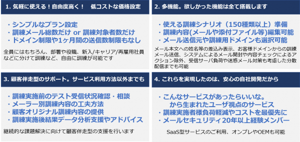 KIS MailMon(R)は、訓練実施者視点で簡単・便利な機能を搭載した、セルフ型の高機能&低コストの標的型攻撃メール訓練サービスです。またサービス以外のサポートでも顧客伴走型支援により安心してご利用できます。