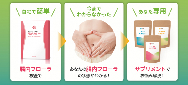 【腸内博士】は自宅で便を採取しポストに投函するだけでかんたんに自分の腸内フローラ(腸内環境)がわかる検査サービスです。近年の研究では腸内フローラが美容に大きく影響することが明らかになり、その状態を良好に保つことがエイジングケアや更年期障害の予防につながると言われています。