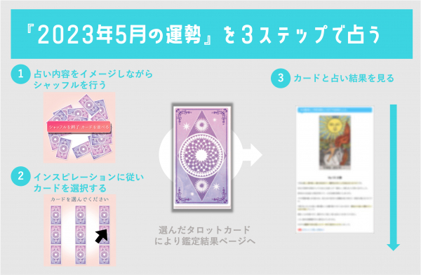 結果として引いたカードは何だったのか、そこから読み取れる5月の運勢はどのようなものか、どういうことに意識を置いて過ごすと良いかなどを解説。今後について悩む人へ1ヶ月間、占いを使った提案を受けることが可能です。