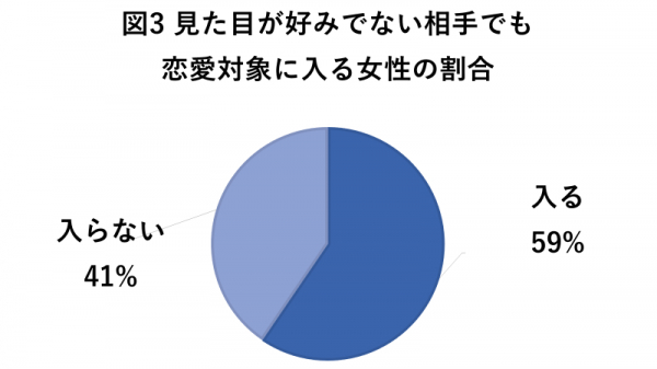 見た目が全く好みでない男性でも恋愛対象に入るか、という問いに対しては「入る」と回答した女性は6割、「入らない」と回答した女性は4割という結果に。