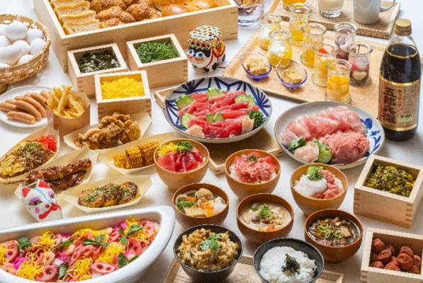 コンセプトは「日本の下町を楽しむ朝ごはん」。豊洲市場直送のマグロをはじめ、オリジナルちらし寿司の「浅草祭り寿司」、両国ちゃんこ鍋風煮込みうどん、ところてんやあんみつなどを用意します。他にもお祭り屋台をイメージしたコーナーでは、焼きとうもろこしやミニお好み焼きを提供します。