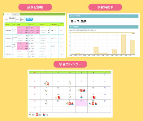 学習結果は表・グラフ・カレンダーに表示され、ひと目で確認することができます。保護者様がお子様の努力の経過を確認し、親子いっしょに成績アップを目指すことで自然と学習習慣が身につきます。