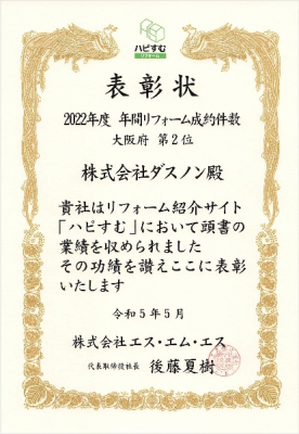 紹介サイトの「ハピすむ」において2023年5月末日付で、2022年度(2022年4月から2023年3月に現地調査に赴いた案件)の年間リフォーム成約件数、大阪府2位を2年連続で達成した