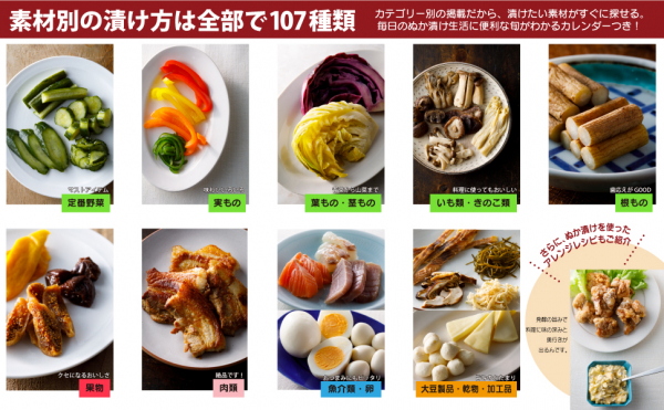 漬け方はなんと107素材!定番から、肉・魚・卵・果物などの変わりダネまでていねいでわかりやすくご紹介するほか、ぬか漬けをつかったアレンジレシピも掲載。