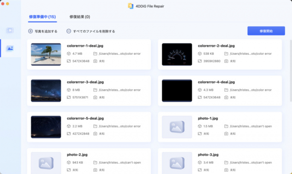 一部、画像をHEICからJPGに変換した際、または変換する前のHEICの画像が破損してしまい開けないということがあります。そんな時には専門の修復ツールの使用をお勧めします。ご紹介するのは「4DDiG File Repair」です。