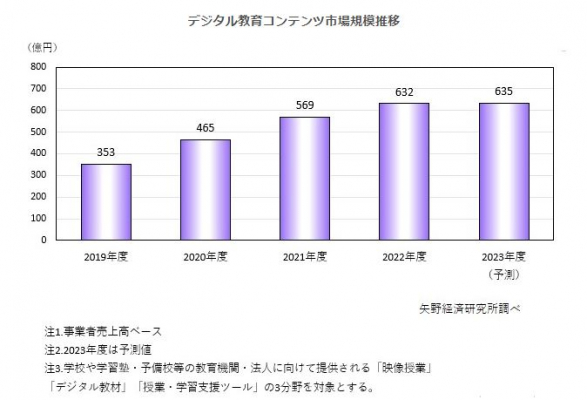 2023年度は「EdTech導入補助金」の付与がなく、予算を捻出できない自治体・学校では学習用ソフトウェアの導入を制限する方向に進んでいることや、民間教育では大学入試の変容により一般選抜に対応した学習需要に停滞がみられていること、コロナ禍を境に活発化したデジタル教材の導入にも落ち着きがみられていることなどから、当該市場の伸び率は鈍化傾向で推移するものとみられ、2023年度のデジタル教育コンテンツ市場規模は前年度比0.5%増の微増で635億円を予測する。