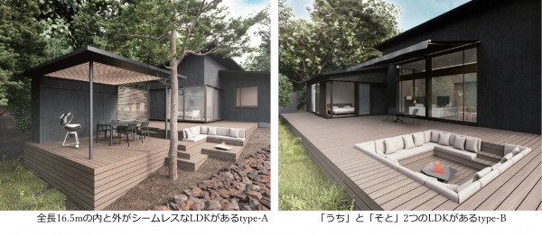 Type-Aは、開放的なリビング・ダイニングが広がり、外部の環境と調和するような仕様。LDKからテラスが拡張されたように伸びていくデザイン設計により、中と外、一体型のLDKとなっています。屋根付きのテラスではBBQ、ファイヤーピットでの焚き火などを楽しむことができ、都会とは違った贅沢な時間を味わえます。