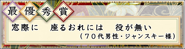 【最優秀賞】窓際に 座るおれには 役が無い (ジャンスキー様・70代男性)