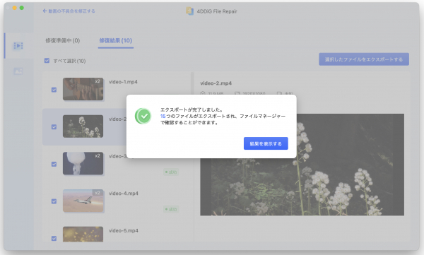 手順3:ソフトウェアは、すぐに動画ファイルの修復を開始します。修復プロセスが完了したら、「結果を表示」ボタンをクリックして、修復された動画をプレビューすることができます。修復された動画を元の動画と比較し、修復の精度を確認することができます。修復の結果に満足したら、「選択した項目をエクスポートする」をクリックして、動画をFinderに保存します。