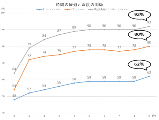 今回の実験では、代表的な断熱材の調湿性を調べるため、3種類の断熱材を入れたアクリルBOXに水の入ったビーカーを入れ密閉、9時間にわたり湿度の変化を調査しました。結果として、9時間後には国内で住宅用断熱材として最も使用されているグラスウールに比べ、デコスファイバーでは20%約も湿度が下がっているという結果となりました。