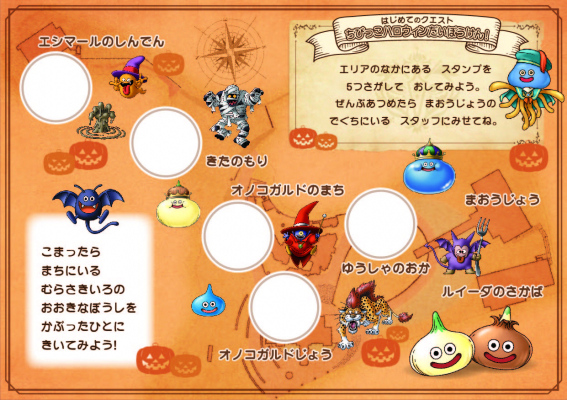 内容:イベント期間中にアトラクションへ入場された4歳以下のお子様1名につき1枚、はじめてのクエスト「ちびっこハロウィンだいぼうけん!」専用のスタンプシートをお渡しします。アトラクション内に設置された5カ所のスタンプ台を見つけ出し、全てのスタンプを集めましょう!