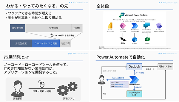 繰り返しの単純作業や、ツール間の転記作業などに時間を取られている、と感じる方に特にオススメしたい講座です。Power Platformはローコードツールなので、プログラミング経験がなくてもアプリ開発や作業の自動化をすることができます。本講座では、Power Platformの各ツールでできることや、実際に業務効率化を行った事例を紹介しており、ご自身の業務にも適用できそうなところを見つけていただけると思います。