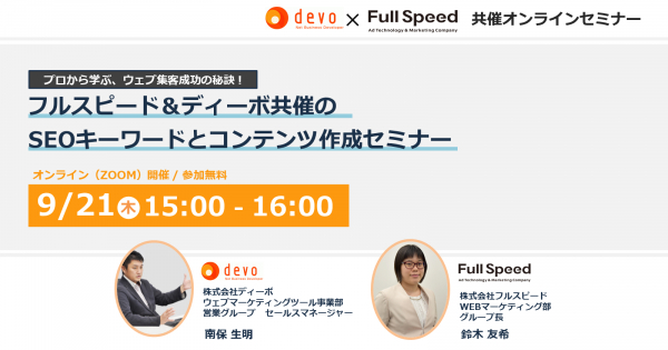 【9/21(木)オンラインセミナー】 プロから学ぶ、ウェブ集客成功の秘訣! フルスピード&ディーボ共催の SEOキーワードとコンテンツ作成セミナー